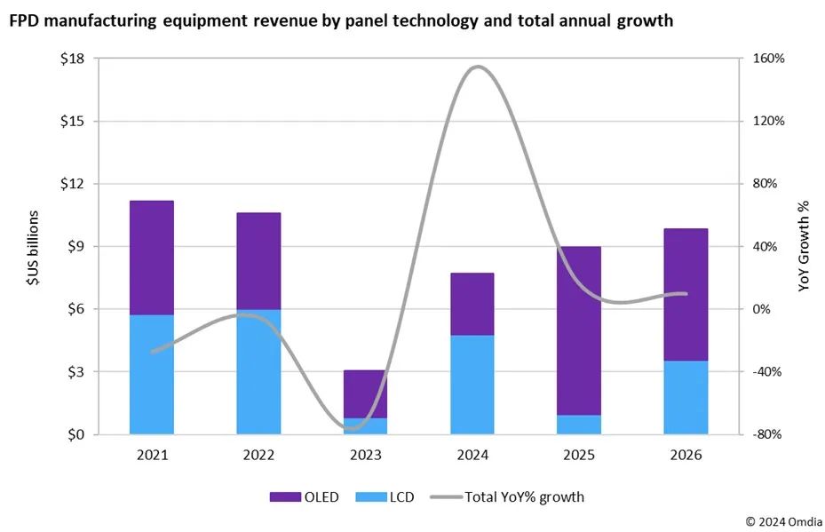 根据Omdia最近发布的报告,随着领先OLED面板制造商正式确认建立基于第8.6代精细金属掩模板(FMM)的OLED工厂,平板显示(FPD)设备市场份额预计将在2024年反弹154%,达到77亿美元,并在2025年和2026年保持稳定。