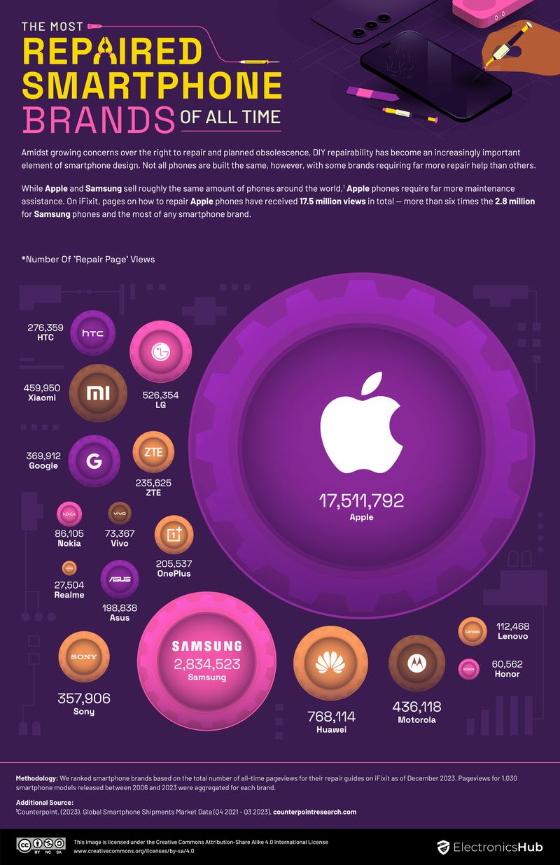 苹果是维修次数最多的智能手机品牌,在 iFixit 上的页面访问量达 17511792 次。