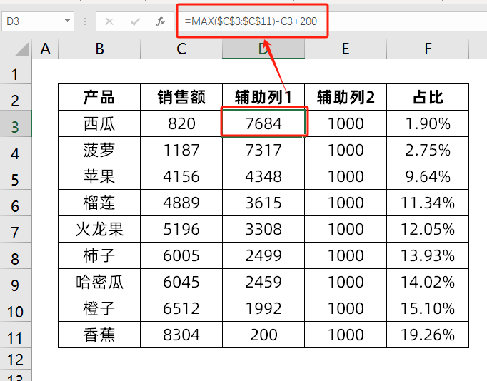 鍏朵腑锛岃緟鍔╁垪 1 涓~鍏ョ殑鏁版嵁锛屼负銆岄攢鍞鏈€澶у€?閿€鍞 + 200銆嶏細