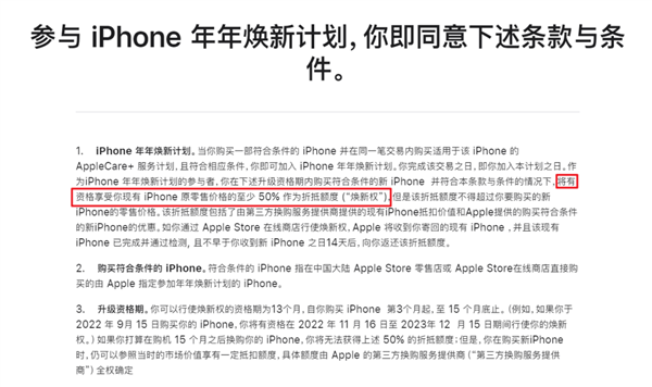 像苹果就有个年年焕新计划,在购机后 3-15 个月内换下一代 iPhone,旧 iPhone 只要满足一定条件,就能享受原零售价格至少 50% 的折扣优惠: