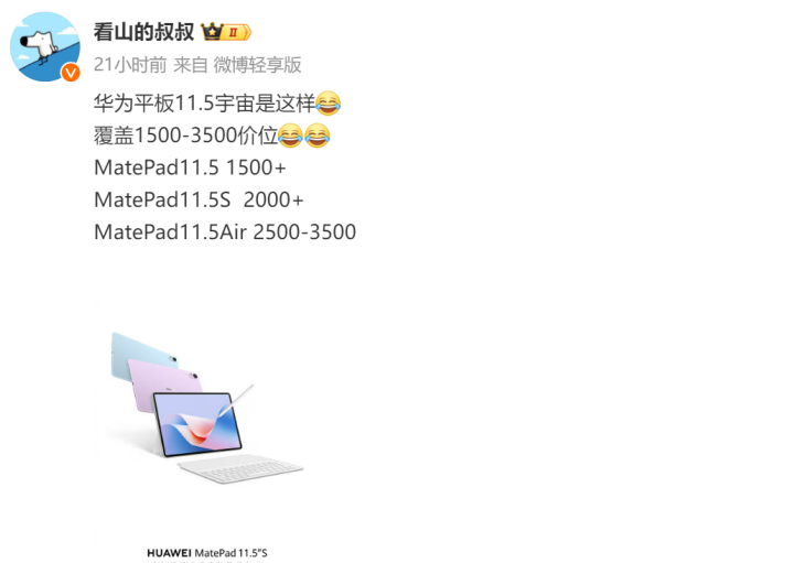 5月11号消息,数码博主@看山的叔叔曝光了华为新款平板MatePad 11.5系列的价格,包括三个版本。MatePad 11.5为1500元+、MatePad 11.5S为2000元+、MatePad 11.5 Air版为2500-3500元。