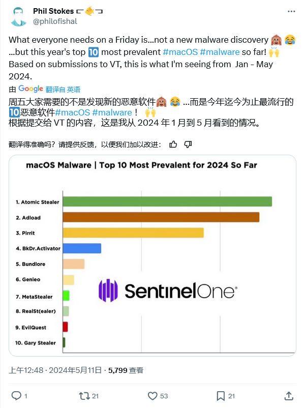 IT之家 5 月 20 日消息,网络安全公司 Sentinal One 的安全研究员兼博主 Phil Stokes 于 5 月 11 日发布博文,统计了今年 1-5 月针对苹果 macOS 系统的恶意软件数量,发现勒索软件、木马和后门程序仍然占据主导地位。