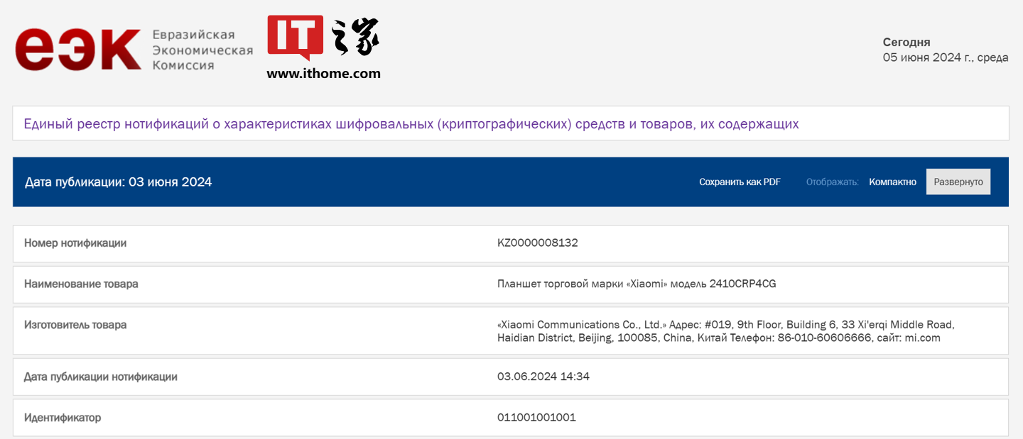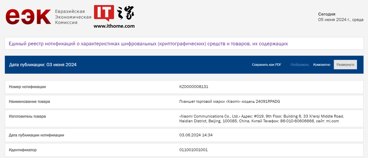 IT之家 6 月 5 日消息,型号为?24091RPADG 与 2410CRP4CG 的两台新品小米平板 6 月 3 日通过欧亚经济联盟 EEC 认证。