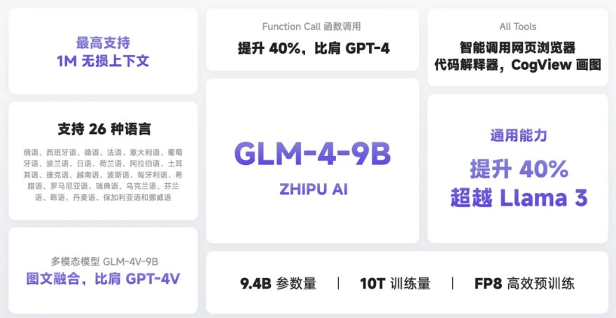 开源方面,为了使小模型(10B 以下)具备更加强大的能力,智谱AI GLM 技术团队进行了大量探索工作。经过近半年的探索,智谱推出了第四代 GLM 系列开源模型:GLM-4-9B。