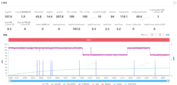就算帧率在?90?和?120?之间反复横跳,但平均帧率仍然有?107.6?,这个帧率在手机阵营里面还是相当夸张的。