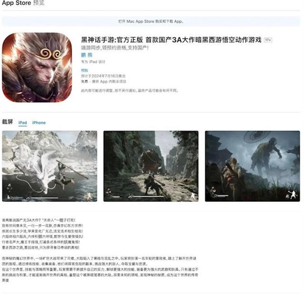 有意思的是,前两天有个新闻,说是苹果国区App Store上线《黑神话手游》,号称“官方正版首款国产3A大作暗黑西游悟空动作游戏”,厂商还贴心加入了游戏的实机原图和“天命人”简介,看上去还挺像回事。