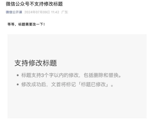 新浪科技讯 7月9日午间消息,微信官方今日表示,微信文章标题支持3个字以内的修改,包括删除和替换,修改成功后,文首将标记‘标题已修改’。今早,有不少微信用户发现,公众号可以支持文章标题修改。修改成功后,将在文首标记“标题已修改”。最新规则显示,已经发送出去的文章,标题支持3个字以内的修改,包括删除和替换。修改后的标题将在文章页、公众号主页、用户新收到的分享卡片中生效。
