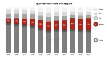 据市场研究公司 Counterpoint Research 最新报告显示,服务收入已经成为继 iPhone 之后苹果的第二大营收来源,有分析师预计,到 2025 年服务收入将占苹果总营收的 25%——这将意味着,苹果服务的年收入将首次超过 1000 亿美元(当前约 7250 亿元人民币),作为对比,小米集团去年的全年营收为 2709.7 亿元人民币。