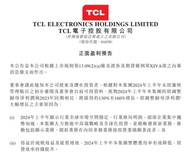 IT之家从 TCL 电子官方公告获悉,该公司预期 2024 年上半年经调整归母净利润与 2023 年同期相比,将录得约 130% 至 160% 增长。