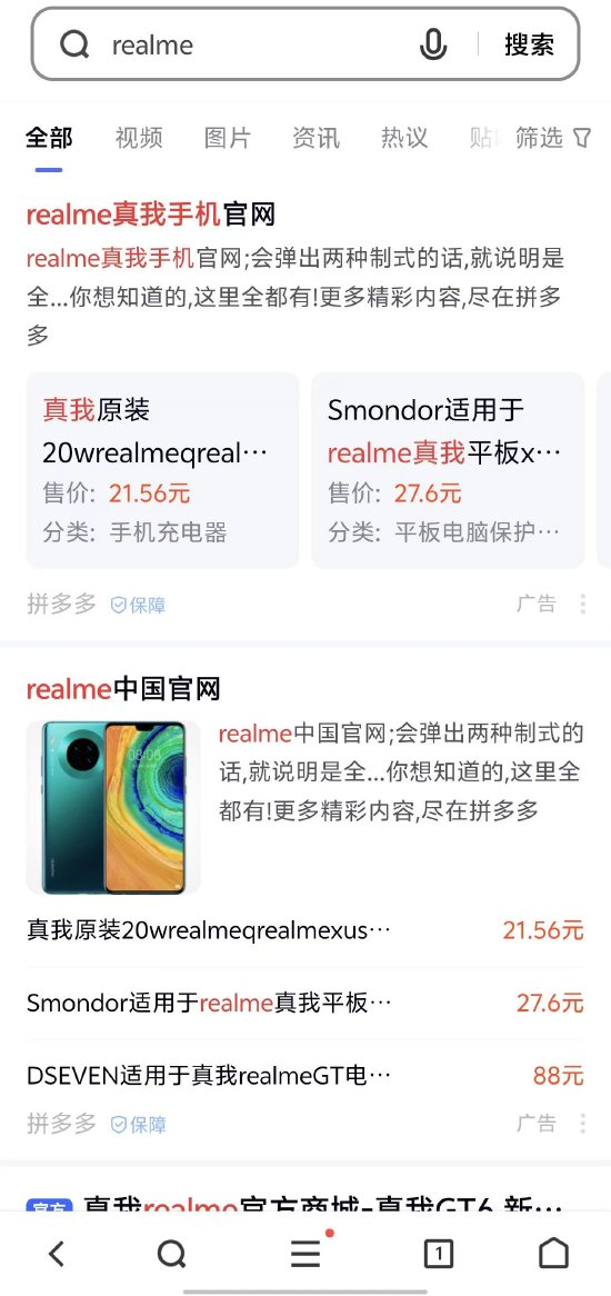 新浪科技用部分浏览器打开百度,搜索realme、红魔等手机品牌,确实出现了这样的情况,第一个搜索结果写着手机品牌的官网,却是拼多多的网站。