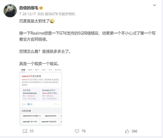 新浪科技讯 7月30日下午消息,OPPO前高管沈义人@自信的眉毛 近日发文吐槽百度,称搜索realme出来的第一个写着官网的链接,却直接进入了拼多多。他吐槽称,百度真是太邪性了,真是一个敢卖一个敢买。