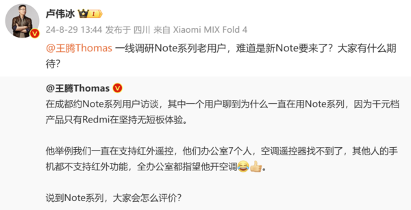 卢伟冰转发了Redmi总经理王腾的一则微博,并写道:“@王腾Thomas 一线调研Note系列老用户,难道是新Note要来了?大家有什么期待?”疯狂暗示新机或即将在不久后跟大家见面。