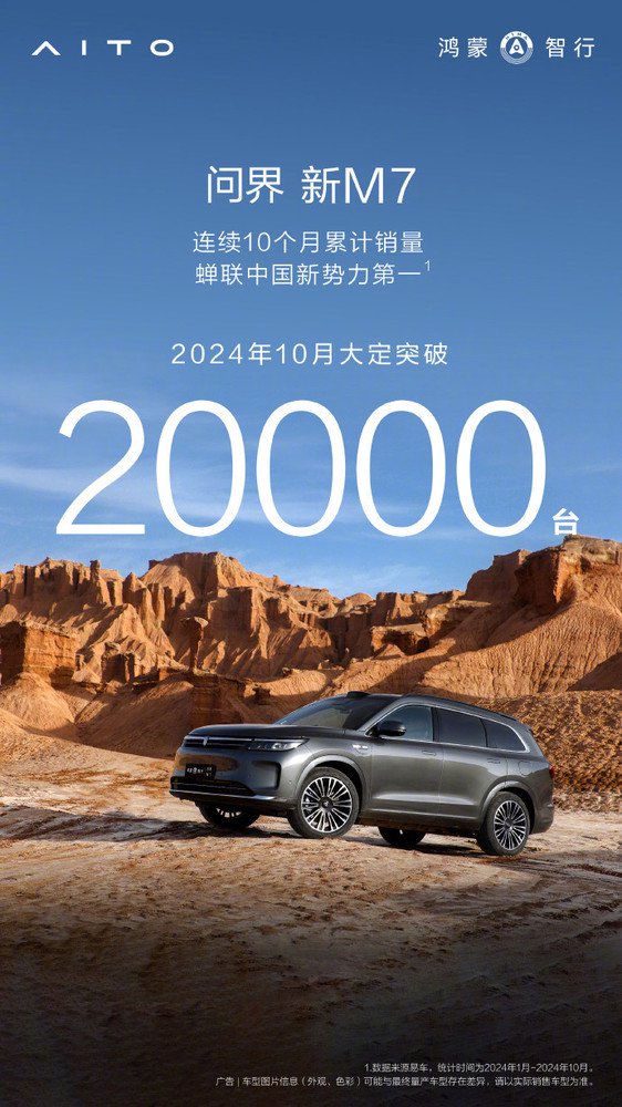 问界新M7 10月大定突破2万台 稳居新势力销量榜首