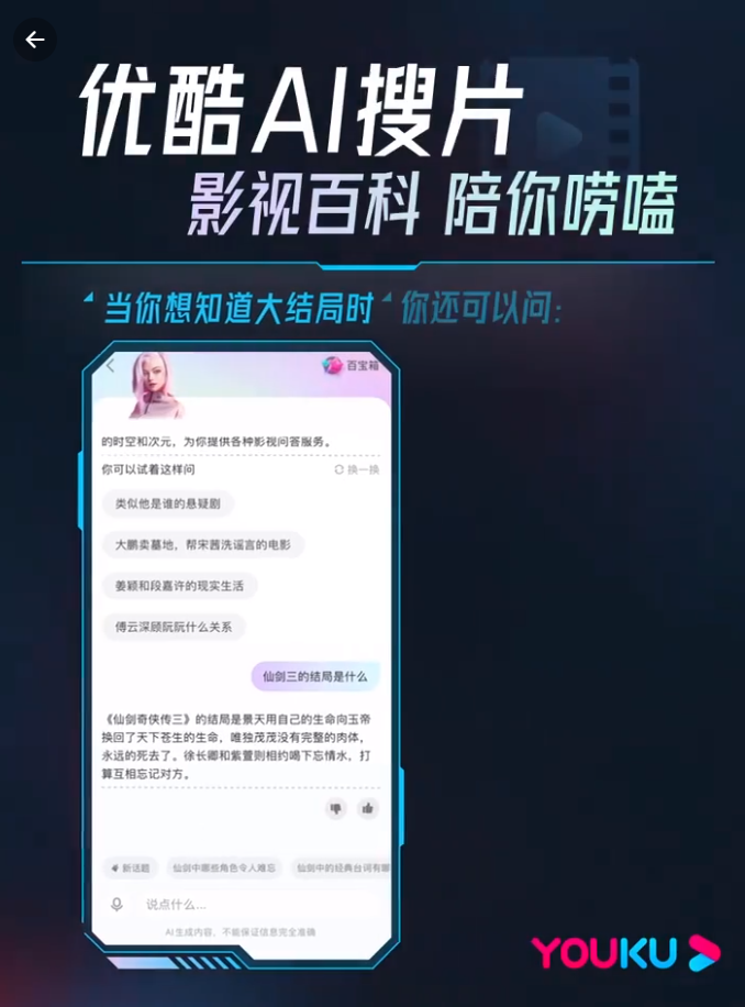 IT之家 12 月 28 日消息,优酷视频今天宣布上线一项新功能“AI 搜片”,号称是全网首个 AI 对话类影视搜索引擎。