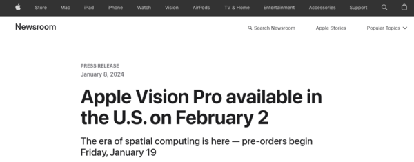 苹果Vision Pro将在2月2日在美上市 1月19日开启预购