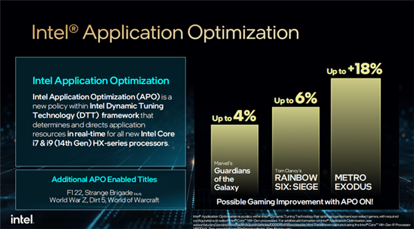 14代酷睿HX系列还加入了全新的英特尔应用优化器(APO),作为动态调优技术框架中的新举措,它能够实时地确定和引导应用资源,聚焦于游戏应用的软件优化,可以与当前现有的英特尔硬件线程调度器对应用线程调度一起,确保更好的应用分线程处理。
