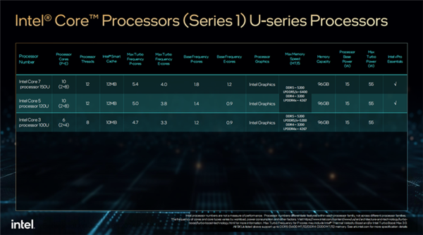 该系列目前提供3个SKU,酷睿7 150U和酷睿5 120U均为10核12线程,酷睿3 100U为6核8线程。