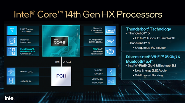 连接性上,14代酷睿HX系列通过集成支持Wi-Fi 6E(Gig+),并可以通过独立方式支持新的英特尔Wi-Fi 7(5 Gig),在更多场景下实现千兆级速度。
