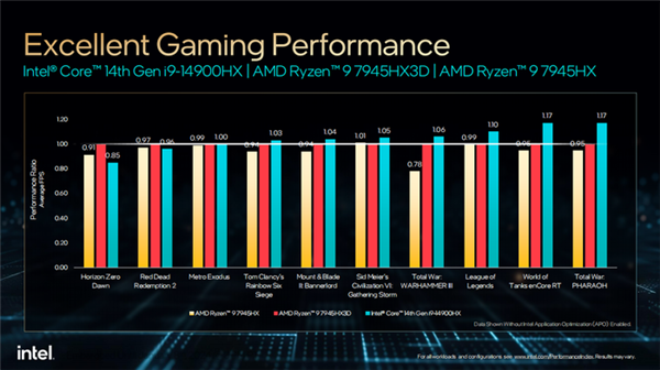 而在与拥有更大缓存的锐龙9 7845HX3D相比,酷睿i9-14900HX在《全面战争:战锤》、《英雄联盟》、《坦克世界》、《彩虹六号》等游戏中同样取得了一定的领先,至高领先17%。